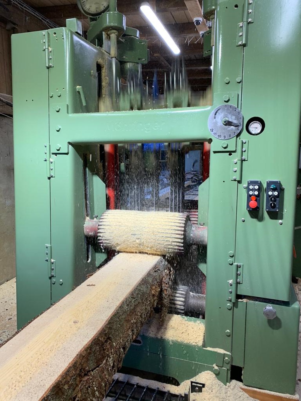 In unserem hochmodernen Sägewerk nehmen wir uns Starkholz von beeindruckenden Dimensionen an, mit einem Durchmesser von bis zu 75 cm und einer maximalen Länge von 13 Metern. Diese eindrucksvollen Holzstämme durchlaufen einen erstklassigen Maschinenpark, der Präzision und Effizienz vereint.